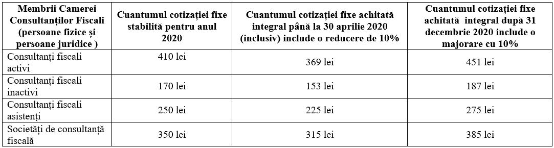 - Cotizații fixe pentru persoanele fizice și persoanele juridice care devin membri ai Camerei Consultanților Fiscali în anul 2020: